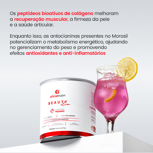 Com apenas 5g por dose, Beauty Slim entrega o potencial do Morosil, ativo extraído da laranja moro, rico em antocianinas que atuam diretamente na estimulação do metabolismo, queima de gordura e efeito termogênico contínuo.