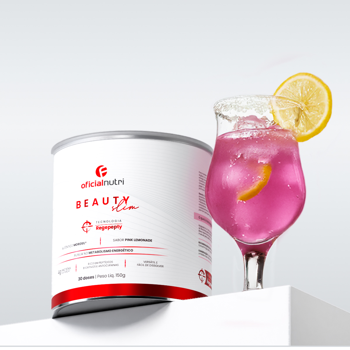 Ingredientes: Sabor pink lemonade: Regepepty (Colágeno hidrolisado em peptideos), Morosil (Citrus sinensis L. Osbeck), sequestrante ácido cítrico INS 330, aroma artificial, antiumectante dióxido de silício INS 551, edulcorante sucralose INS 955.