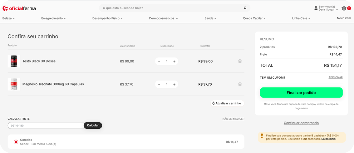 Se você gastar R$ 150,00 em uma compra, você receberá 7,5 cashback.